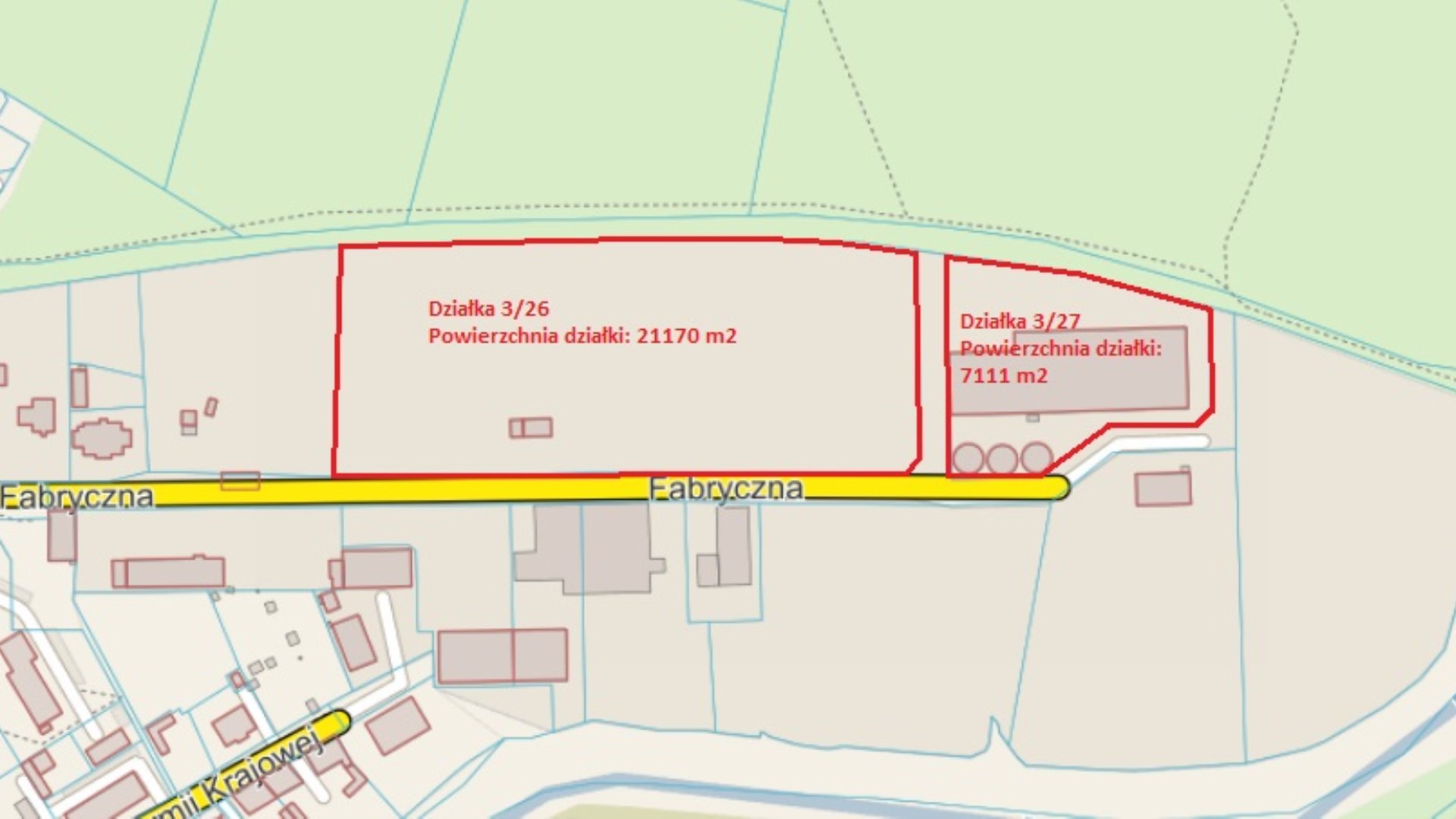 Na działce 3/27 znajduję się magazyn o powierzchni 2808 m2 przeznaczony do rozbiórki lub adaptacji. Dojazd drogą utwardzoną.