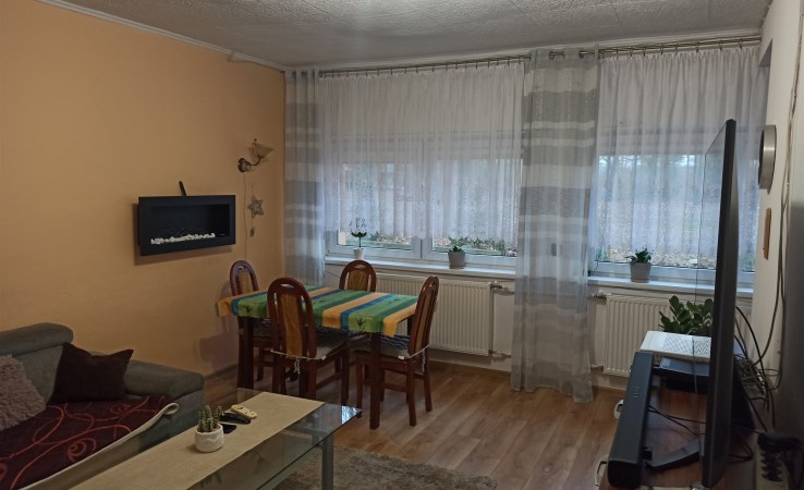 W obu pokojach na podłogach położona jest wykładzina PCV, ściany wygładzone pomalowane. Do jednego z dwóch pokoi wchodzi się przez kuchnię. Kuchnia umeblowana, na podłodze wykładzina PCV, ściany wygładzone i pomalowane. W łazience położona jest wykładzina PCV i znajduje się w niej kabina prysznicowa. Okna nowe plastykowe, mieszkanie można ogrzewać trzema źródłami ciepła - ogrzewanie etażowe piec na paliwo stałe, ogrzewanie gazowe i istnieje także możliwość ogrzewania elektrycznego.